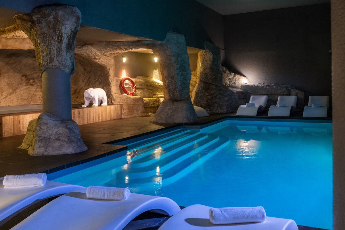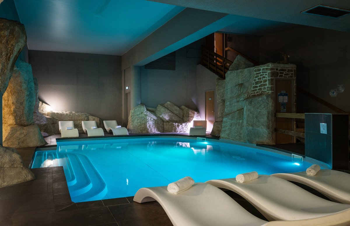 Une piscine intérieure, un bain sculpté dans la pierre, des transats pour s’accorder une pause hors du temps et un sauna pour prolonger l’expérience.